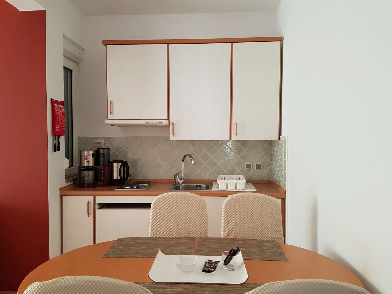 -Küche inklusive Kochutensilien, Filterkaffeemaschine, Wasserkocher und Toaster